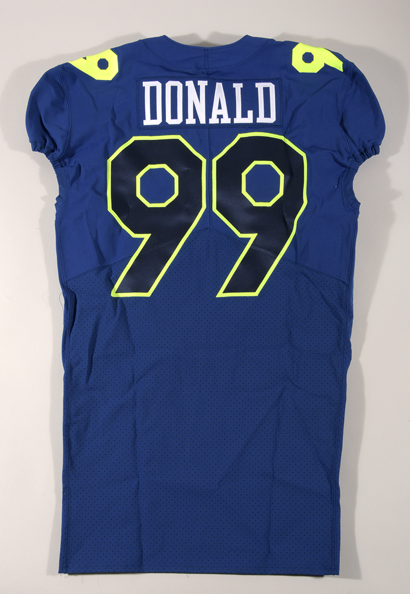 Description:Aaron Donald 2017 game issued Pro Bowl jersey. Nike size 44 NFC #99 Aaron Donald jersey with proper On Field tagging inside the collar. Includes NFL Auctions COA from PSA/DNA, with matching serial #ed sticker affixed to the jersey. Shows no signs of use/wash wear: NM