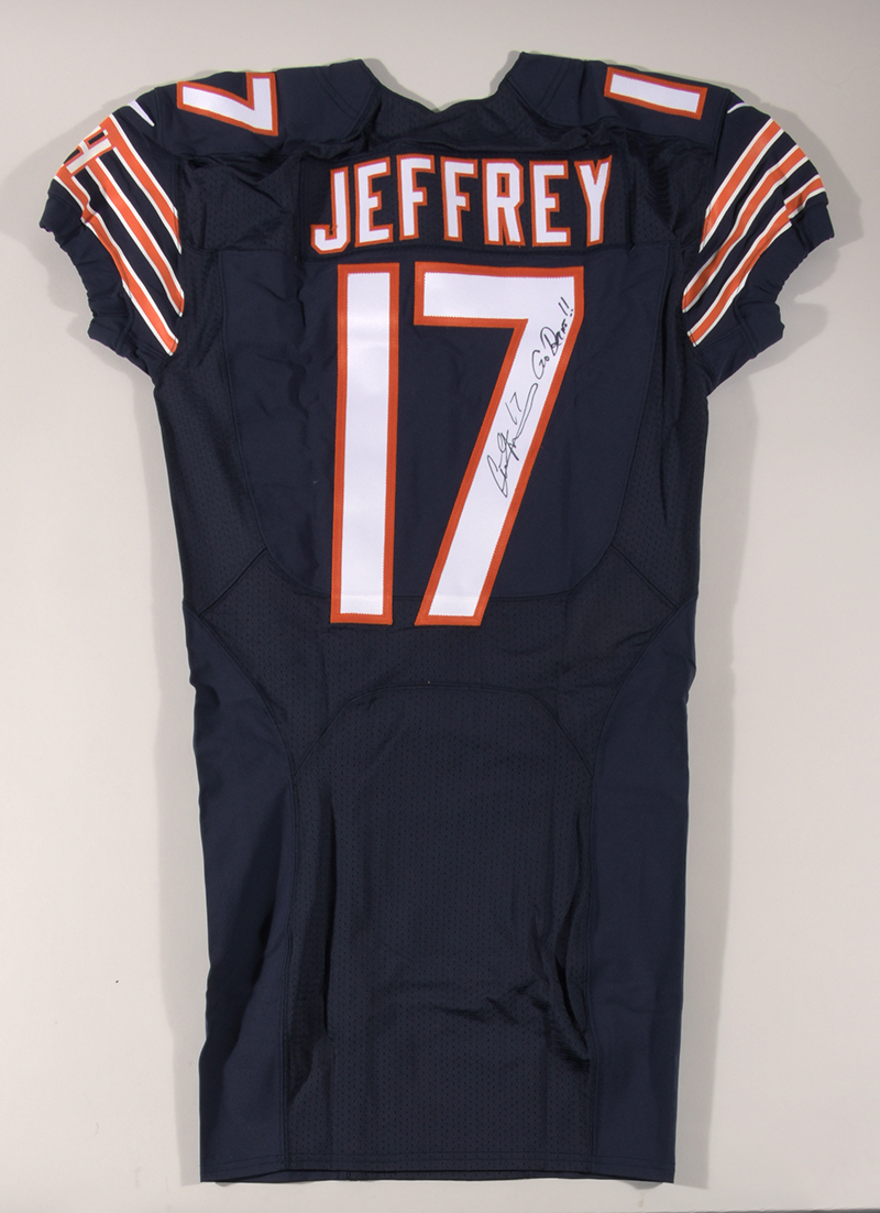 Description:2016 Alshon Jeffery autographed Chicago Bears game issued jersey. Nike size 40 Bears #17 Alshon Jeffery jersey with proper On Field tagging inside the collar. Jeffery signed the jersey in black marker and added "Go Bears!!" inscription. Signature rates 8/9 out of 10. Includes NFL Auction COA from PSA/DNA (matching serial #ed sticker is affixed to the jersey). Little to no use/wash wear: EX/MT-NM
