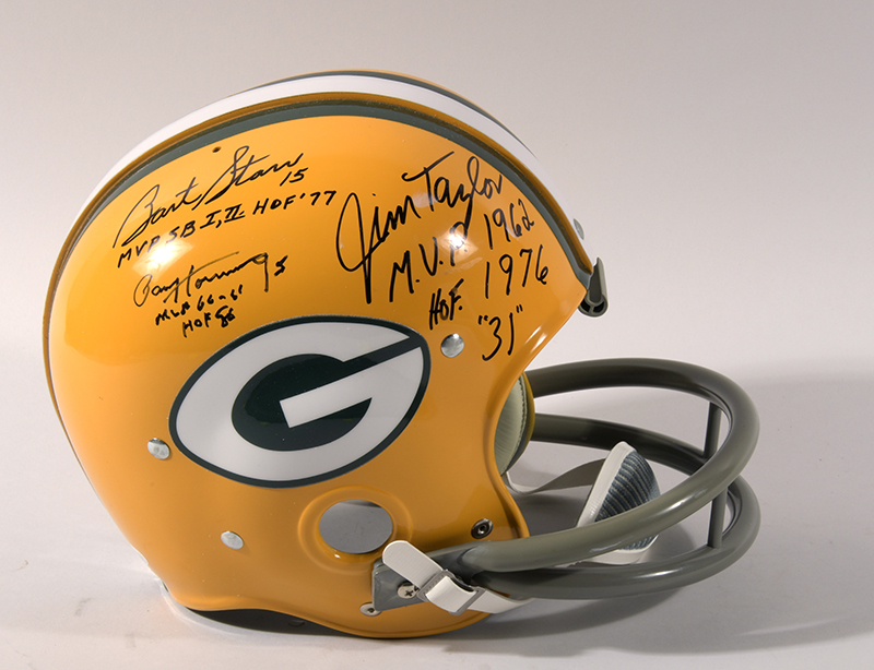 Description:Green Bay Packers Hall of Famers autographed throwback helmet. High quality RK-2 model helmet with two-bar facemask is done in Packers colors with team logo decals applied to either side. Signed, with related M.V.P. and HOF inscriptions, by "Bart Starr", "Jim Taylor", and "Paul Hornung." Black marker signatures rate 8 to 9 out of 10 with Taylor having a few minor flaws. JSA Authentication sticker affixed (COA is not included): EX/MT-NM