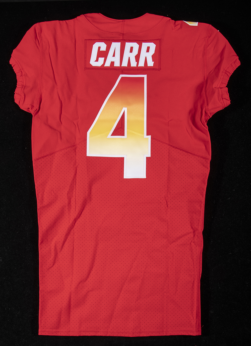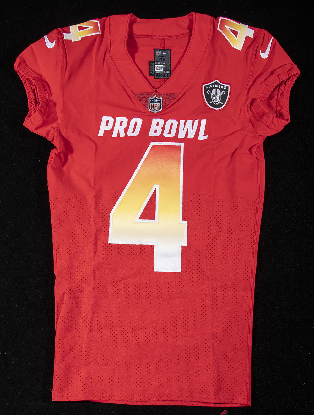 Description:Derek Carr 2018 game issued Pro Bowl jersey. Nike size 42 #4 Derek Carr jersey with proper On Field tagging inside the collar. Includes NFL Auction COA from PSA/DNA, with matching serial #ed sticker on the jersey. Shows no signs of use/wash wear: NM