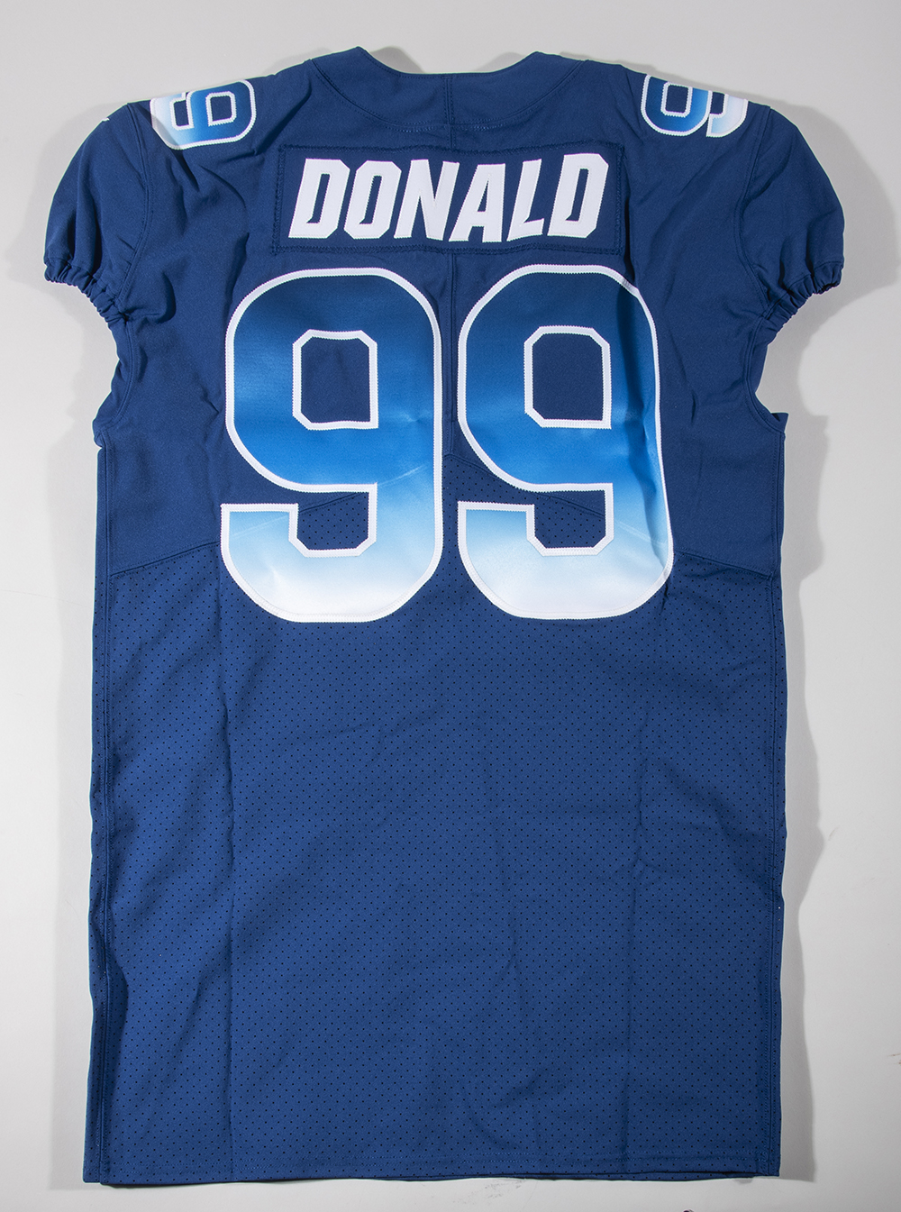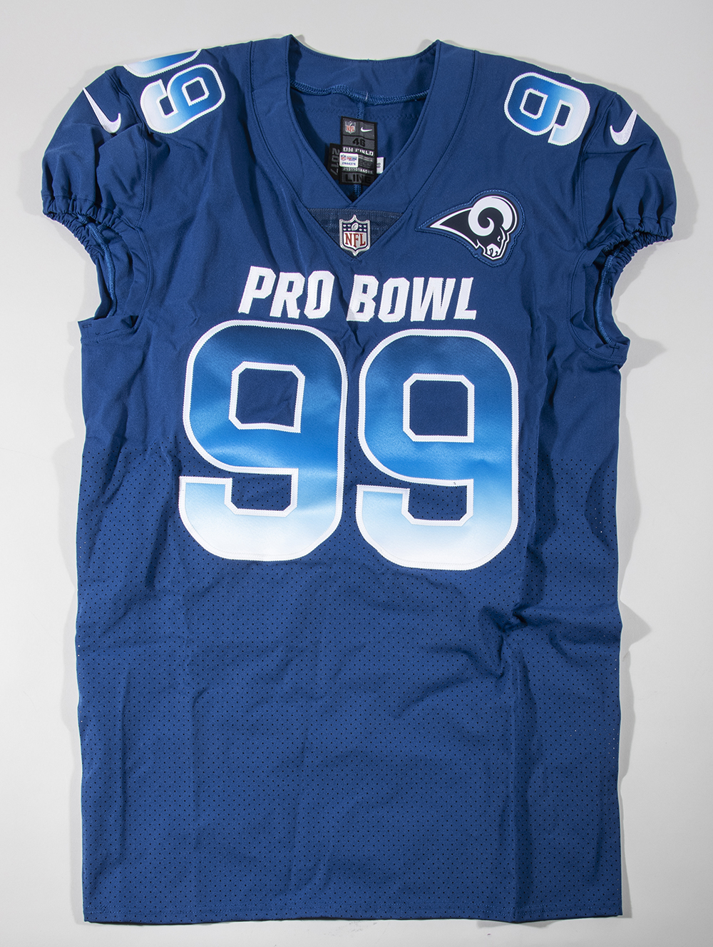 Description:Aaron Donald 2018 game issued Pro Bowl jersey. Nike size 46 #99 Aaron Donald jersey with proper On Field tagging inside the collar. Includes NFL Auction COA from PSA/DNA, with matching serial #ed sticker on the jersey. Shows no signs of use/wash wear: NM