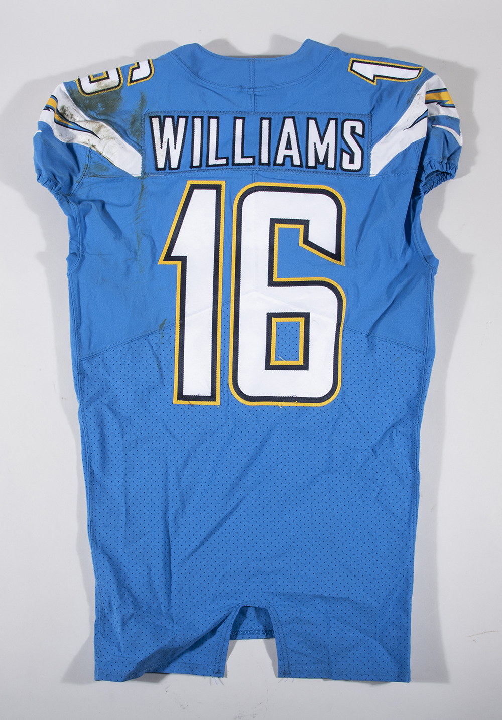 Description:10/21/2018 Tyrell Williams game worn Los Angeles Chargers jersey. Nike "On Field" size 42 Chargers #16 Tyrell Williams jersey worn during their International Series game in England against the Titans. Williams had 4-catches for 118-yards and a TD in the game. The jersey has large stains on the front, back, and shoulders. Includes NFL Auction COA from PSA/DNA, with matching serial #ed sticker on the jersey: EX