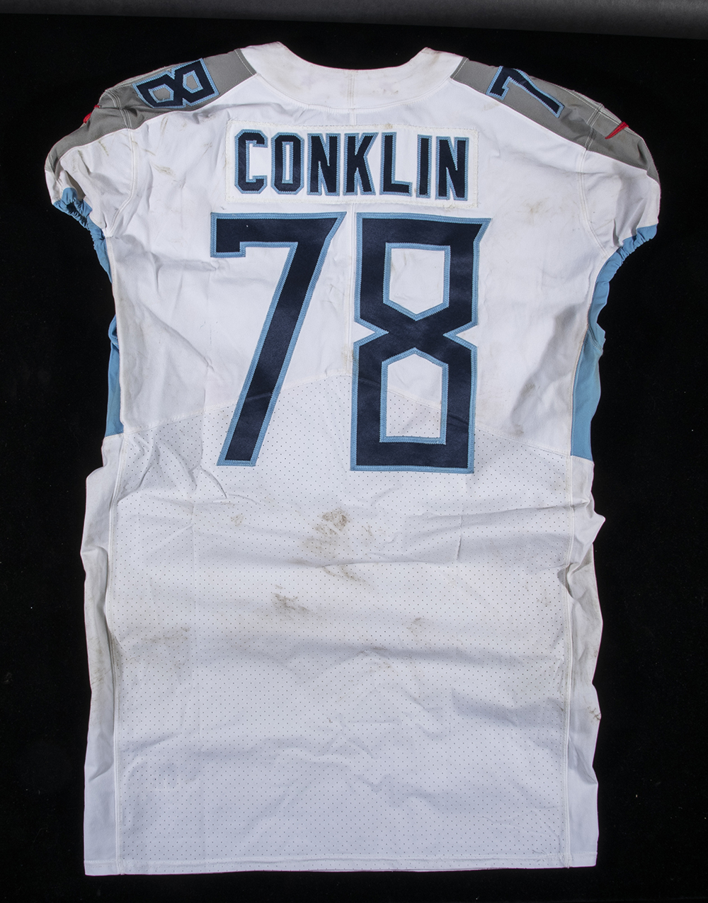 Description:10/21/2018 Jack Conklin game worn Tennessee Titans jersey. Nike "On Field" size 48 Titans #78 Jack Conklin jersey worn during their International Series game in England against the Chargers. The jersey shows exceptional use with heavy stains covering the front. Includes NFL Auction COA from PSA/DNA, with matching serial #ed sticker on the jersey: EX