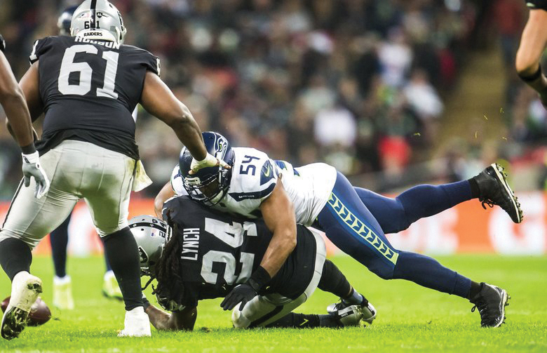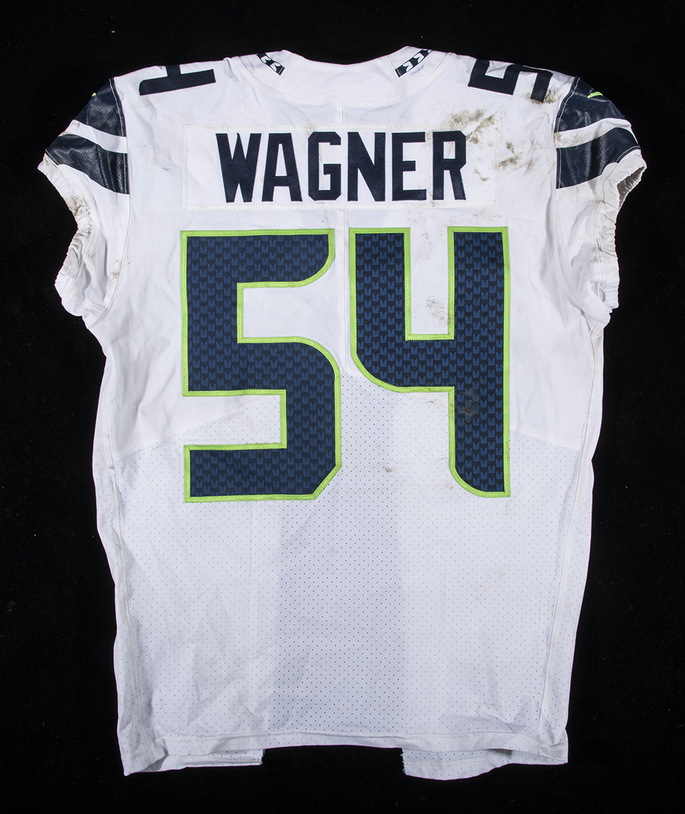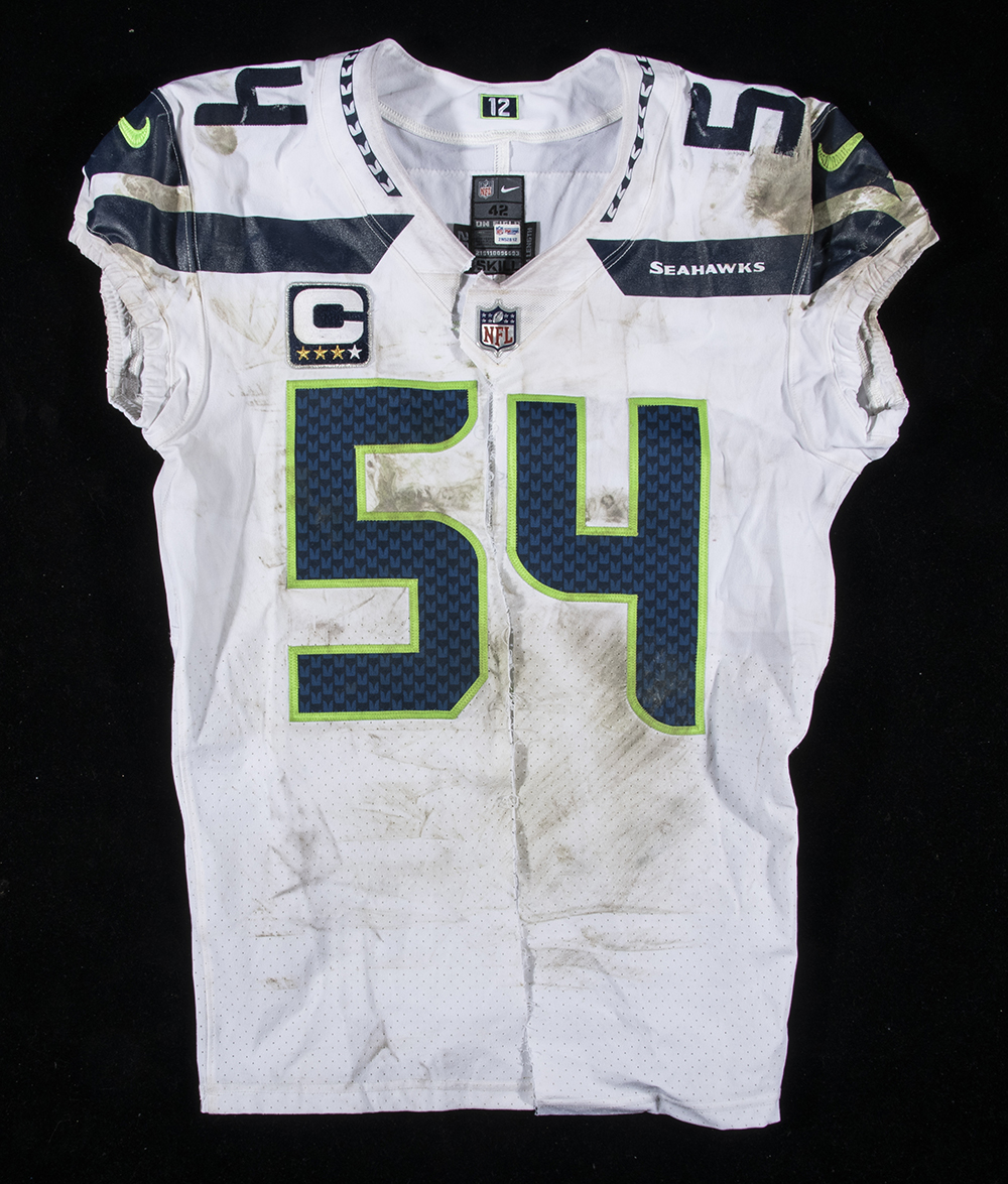 Description:10/14/2018 Bobby Wagner game worn Seattle Seahawks jersey. Nike "On Field" size 42 Seahawks #54 Bobby Wagner jersey worn during their International Series game in England against the Raiders. Wagner recorded 4-tackles in the game. The jersey shows exceptional use with large stains on the front and back (the front of the jersey has been cut open). Includes NFL Auction COA from PSA/DNA, with matching serial #ed sticker on the jersey. Their database notes that the jersey was cut down the middle post-game: VG/EX