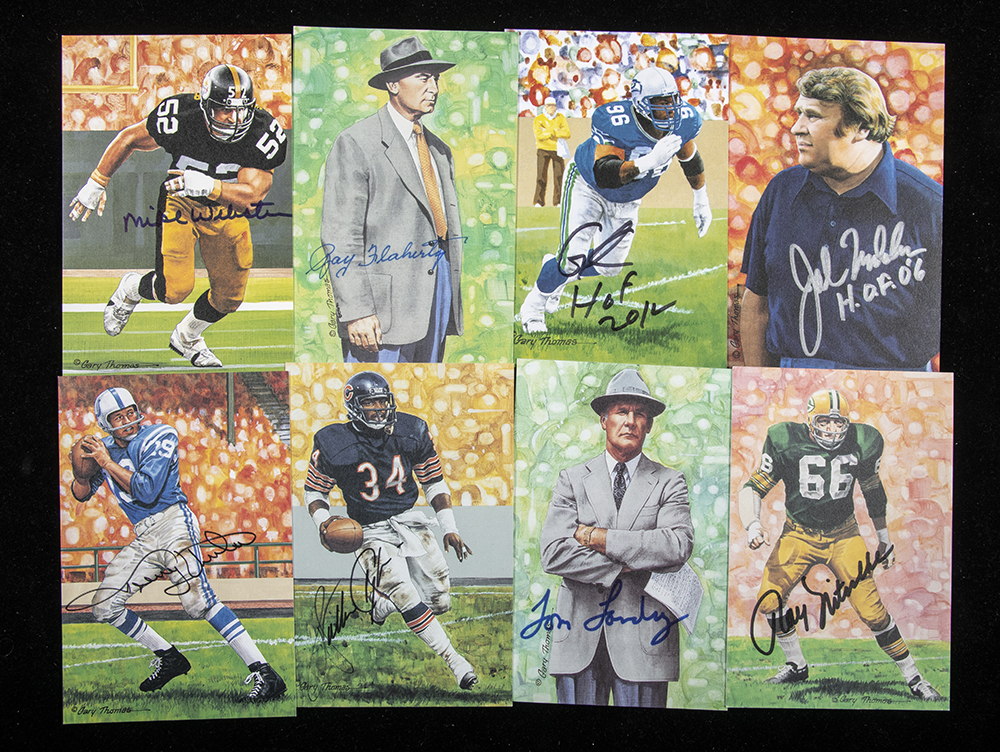 Description:Large collection of (86) autographed Goal Line Art cards with many tougher names. Includes Unitas, Trippi, Tittle, Matson, Parker, Webster, D.Walker, Turner, Nitschke, Payton, C.Kennedy, Van Buren, Stautner, Buchanan, R.Brown, Motley, Wojciechowicz, St.Clair, Lavelli, S.Young, B.Willis, S.Jones, Staubach, D.Sanders, Schramm, L.Taylor, Butler, Stallworth, Landry, Ewbank, Stram, Flaherty, J.Ham, Mara, J.Kelly, Moon, Woodson, J.Greene, Madden, L.Hunt, Stenerud, R.Wilson, and many others, with most having their HOF inscription. Signatures rate 7 to 10 (avg 8/9) out of 10. Many include tickets/information regarding the date/location of signing. The lot also includes a JSA auction LOA: NM overall