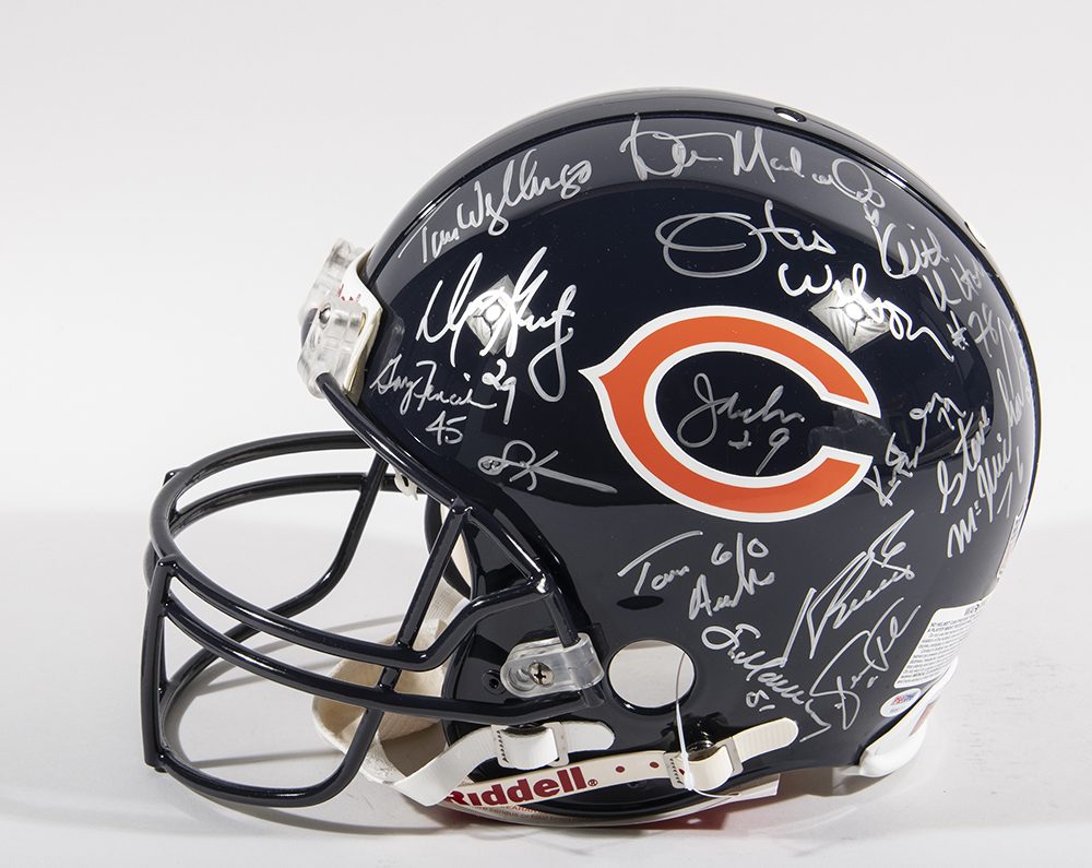 Description:1985 Chicago Bears autographed full size helmet. Riddell VSR4 Pro Line helmet signed by (30) members of the Super Bowl XX Champions including Mike Ditka, Mike Singletary, Dan Hampton, Richard Dent, Jim McMahon, Wilber Marshall, Otis Wilson, Willie Gault, Jim Covert, Shaun Gayle, Jay Hilgenberg, Kevin Butler, Keith Van Horne, Mike Richardson, Mark Bortz, and others. Signatures rate 7/8 to 9/10 out of 10. Includes full LOA from PSA/DNA, with matching serial #ed sticker on the helmet: NM