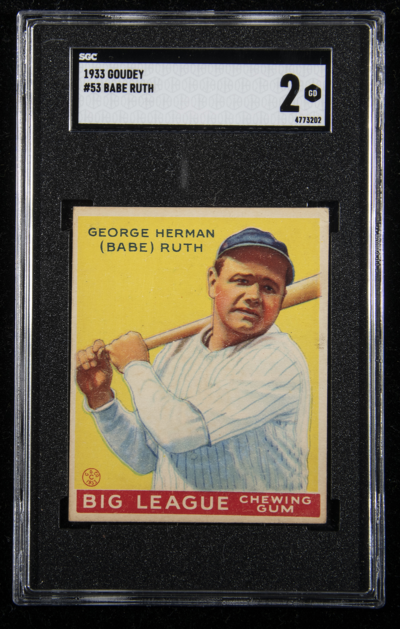 1933 Goudey #53 Babe Ruth. Crisp and clear, well centered image on card with very strong overall appearance from the grade. Small amount of wear on upper back: SGC 2 GD