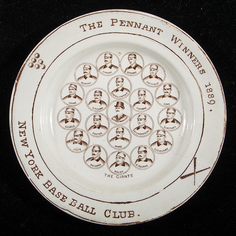 1889 New York Giants "Pennant Winners" plate. Period piece done in porcelain depicting team members incl. Buck Ewing, Roger Connor, John M. Ward, and Tim Keefe. Minor scattered wear with surface crazing throughout: EX