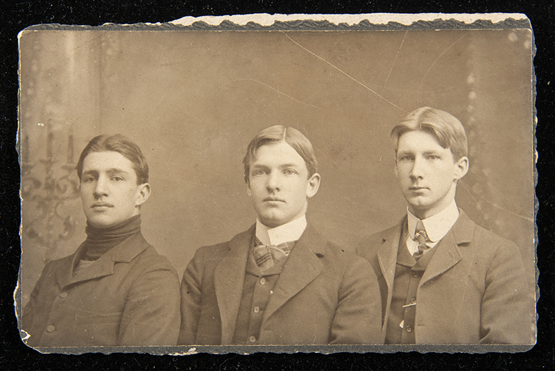 Description:Christy Mathewson and his brothers photograph c.1900s-10s. Sepia toned approx. 2.5"x4" photo showing Matty in the center with a brother on either side. Image itself displays a hint of light wear and is mounted to backing which has wear/chipping to edges: Image EX
