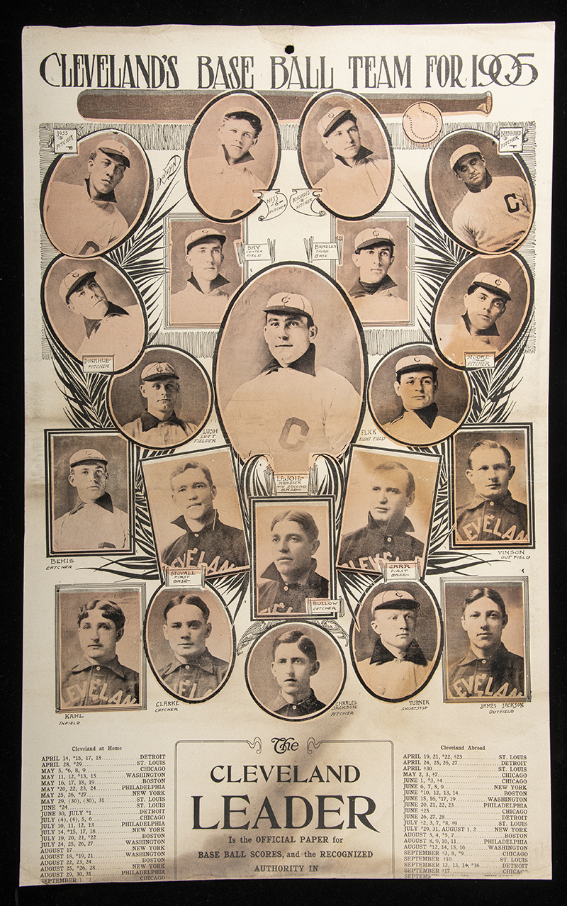 Description:Rare 1905 Cleveland Naps large format pictorial schedule. Oversized piece (16"x25.75") issued in the period to promote "The Cleveland Leader" newspaper is titled "Cleveland's Base Ball Team For 1905" at the top. Pictured are team members including Addie Joss, Elmer Flick, and namesake Manager Nap Lajoie. Done on fragile thin stock it has been professionally conserved and mounted to board with scattered toning/discoloration and wear including some scattered chips and tears. The lower edge has been trimmed off. The first of its type we have seen: GD with note to description