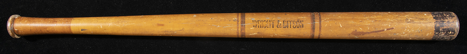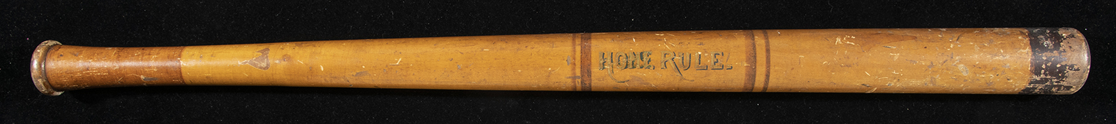 Description:Outstanding Wright & Ditson ring decorated "Home Rule" baseball bat c.1880s. Early 38.25" hand turned bat featuring (4) rings at the center which surround a "Wright & Ditson" makers mark. Opposite this the words "Home Rule" have been painted in gold and black lettering. Either end is likewise painted with a darker finish. In fine overall condition with mild scattered wear to include several scrapes and scuffs. One of the better condition and more visually appealing examples we have handled: VG-EX