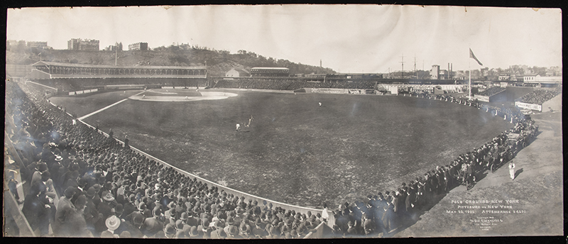 Description:Mammoth May 20, 1905 Pittsburgh Pirates vs. New York Giants panoramic photograph by George Lawrence. Magnificent large format photograph taken from a deep right field vantage showing game action in the Polo Grounds. Captioned within at lower right corner and marked "1905...Geo. R. Lawrence." Mounted to linen with scattered toning/discoloration and wear that primarily effects the corners and/or edges. The most notable flaw is a puncture/tear near the center which can clearly be seen however was largely reversed when the piece was backed. One of perhaps two or three examples known *Image measures 46"x19" and it has been framed to 56"x29.5" for display: GD