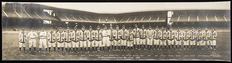 Description:Exceptional 1910 Cleveland Naps panoramic photograph. Choice sepia toned 10"x38" photograph showing team members posed shoulder to shoulder including namesake Manager Napoleon Lajoie, Addie Joss, and the venerable Cy Young. In fine overall condition with a few scattered wrinkles and hint of other wear. Captioned within at lower front along with last name player identifiers and a "Haines Photo Co" studio mark. Extremely rare with this being one of only a select few known examples: EX