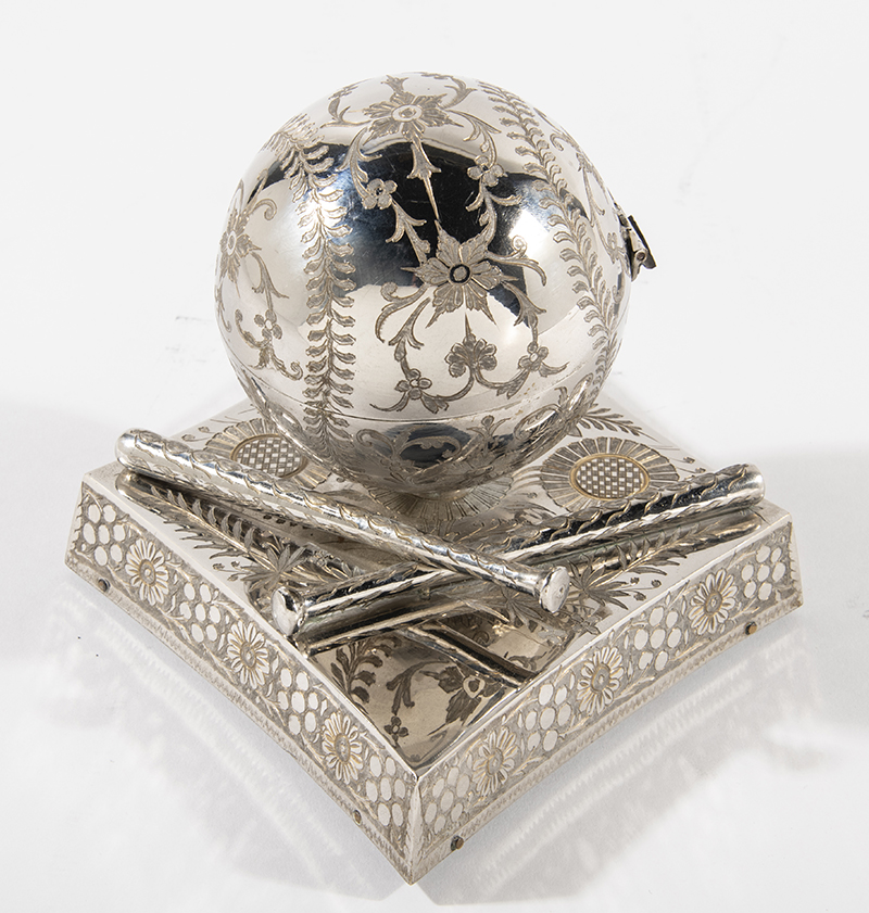 Description:Exquisite figural baseball music box c.1920s. Ornate silver-plated figural music box is composed of an oversized baseball shaped compartment atop a diamond shaped base with crossed bat decoration. The lid to the baseball compartment lifts to reveal a windup music box which plays "Take Me Out To The Ball Game". Craftsmanship is of the highest quality inclusive of intaglio decor etched throughout the surface of the piece. One of only a handful of documented examples known. Of those known, two were presented to baseball luminaries such as the Wrigley family of Chicago. In outstanding original condition with little to no mentionable wear. Overall size is quite impressive measuring 11" long at the base: EX/MT-NM