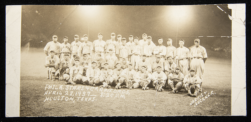Description:1937 Philadelphia Stars and Pittsburgh Crawfords photograph. Sepia toned 3.25"x7" photo showing members from both teams who counted among their rosters some of the most noted players of the period. Mild wear throughout includes creasing and a tear to upper right corner. Marked "Harris + Buckner" within and captioned with "April 28, 1937...Houston, Texas" identifier. Presumably from the Ted Page Collection as it came to us with the other Page related material in this sale: GD