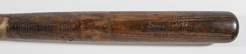 Description:George L. Kelly professional model baseball bat c.1920s. Louisville Slugger 125 model bat with Kelly facsimile signature burned into the barrel measures 36" long and weighs 35.7oz. Strong usage wear is evident throughout with pronounced grain swelling to the reverse barrel secured in placed with several vintage nails/tacks. A handle crack was secured with a ring of tape which has left a toned band mid-handle. Some faint and not discernable side writing is partially visible and what appear to be remnants of period mailing labels (applied when the bat was sent back to Louisville Slugger to be used a model for future orders) are affixed in two places. One of the era's premier defensive position players, Kelly set numerous records throughout the 1920s and in the earlier part of the decade played on a pair of Championship teams. Includes LOA from Hunt Auctions and there is a MEARS hologram affixed (graded "A7", letter is not included): EX