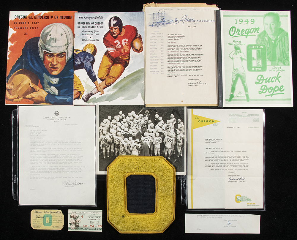 Description:Archive of Norm Van Brocklin University of Oregon related memorabilia c.1946-1949. Intact grouping of materials as related to Van Brocklin's All-American career at the University of Oregon. Lot will include: NVB's University of Oregon letterman's sweater "O" patch and (5) jacket buttons; 1946 recruitment letter as sent to NVB from Oregon coach Tex Oliver (signed); NVB Oregon Varsity member card; (4) game action 8"x10" photos by W.Kirk Braunl; (2) 1947 and 1948 typewritten letters from Oregon Club; 1949 Cotton Bowl award dinner ticket/game ticket stub/souvenir breakfast menu; 15+ Cotton Bowl related telegrams as sent to NVB; small typed note signed by Dan Reeves to NVB (signed "Dan"); (2) 1949 Oregon "Duck Dope" yearbooks with NVB on cover; 11/1947 Oregon/Washington State program; 10/1947 Oregon/Nevada program; 10/1948 Oregon/St. Mary's program; 10/1948 Oregon/Wash State program; 10/1948 Oregon/USC program; and several misc. letters/paper items. Condition is generally very fine with expected handling/age wear. Includes letter of provenance from the Van Brocklin family: Range GD-NM