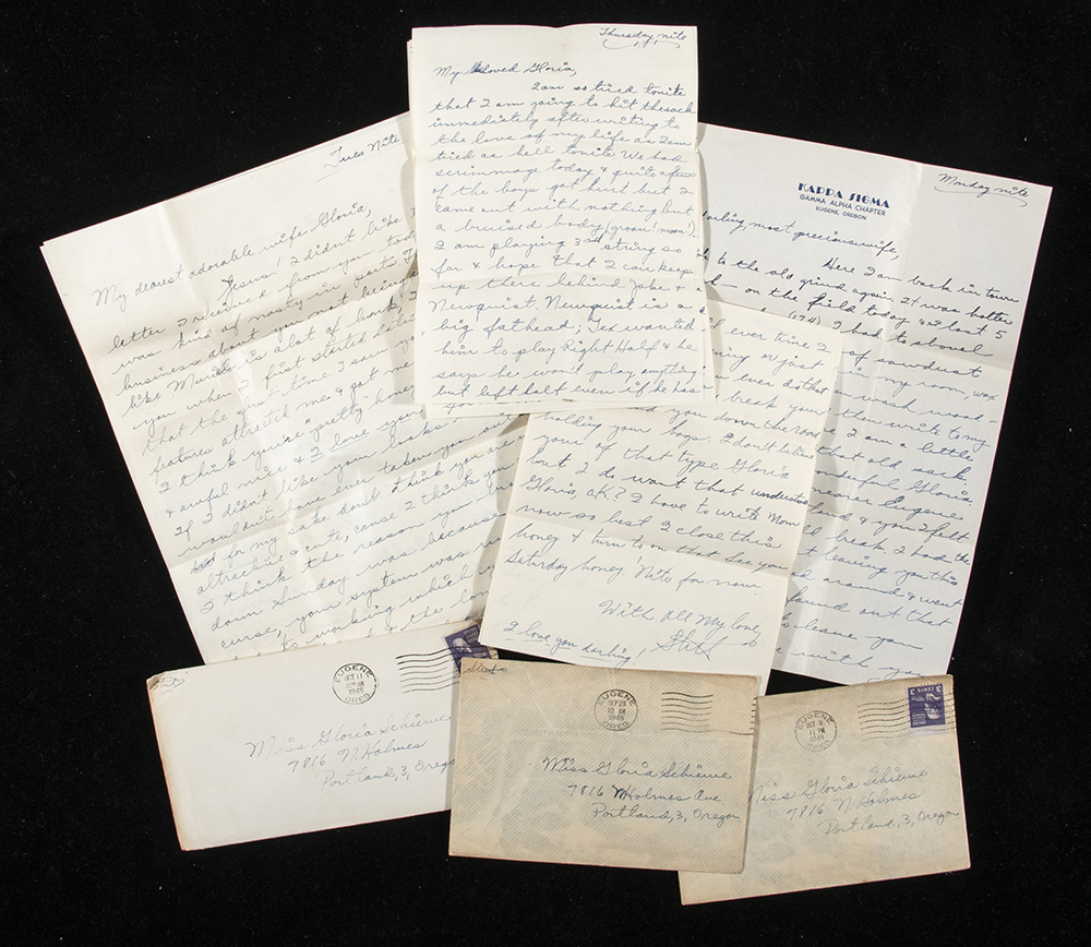 Description:Archive of Norm Van Brocklin handwritten letters c.1946-47. Notable cache of approx. (51) different handwritten letters as sent to his girlfriend Gloria Schieve who of course became his wife at later date. Content ranges from typical topical items of the period, wedding plans, and other general subjects. There are a good number of letters with interesting football content providing insight into Van Brocklin's early career at Oregon. One passage reads, in part, "Am gonna start working out between 5-6 in the afternoon from here on playing football & doing lots of running 'cause baby our future depends upon my ability to play football this coming season."- Letters are all signed "Stub" which was Van Brocklin's nickname and the majority of the mailing envelopes have self identifier of "Stub" as well. Includes auction LOA from JSA and letter of provenance from the Van Brocklin family: Range VG-NM
