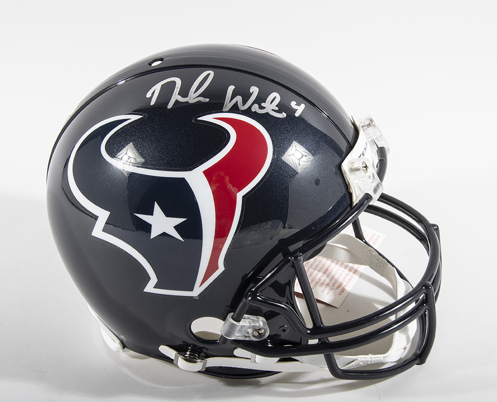 Description:Deshaun Watson autographed Houston Texans full size Pro Line helmet. Riddell VSR4 helmet signed by Watson in silver marker. Signature rates 9 out of 10. Includes NFL Auction COA from PSA/DNA, with matching serial #ed sticker on the helmet: NM