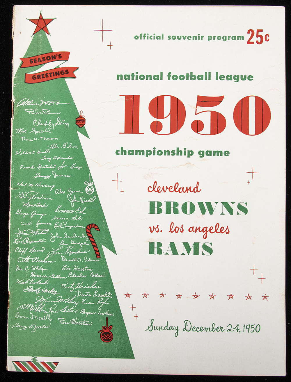 Description:1950 NFL Championship Game program. Original program as issued for the NFL title game played between the Cleveland Browns and Los Angeles Rams in Cleveland. General light wear including minor creasing and some cover soiling. Includes letter of provenance from the Van Brocklin family: VG-EX