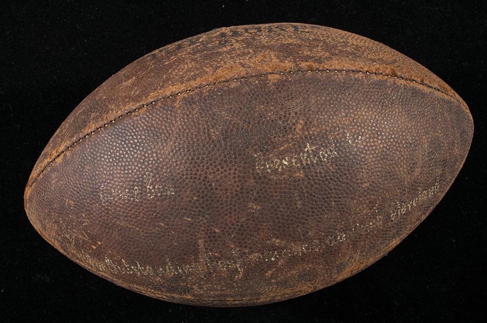 Description:Pete Rozelle "Game Ball" from the Norm Van Brocklin Collection c.1959-60. Official Pete Rozelle NFL football with proper Thorp Sportings Goods made by Wilson stampings. Hand notated on side panel, "Game Ball Presented to For Outstanding Performance (illegible) Cleveland". The inscription has some fading and is also partially illegible but we believe it may have been given to Van Brocklin as a member of the Philadelphia Eagles in either 1959 or 1960 as the Eagles played Cleveland on several occasions. Evident use throughout with bold manufacturer's stampings. Includes letter of provenance from the Van Brocklin family: VG