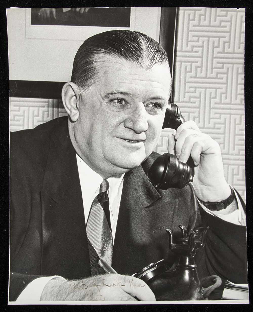 Description:Bert Bell autographed photograph inscribed to Norm Van Brocklin. Black and white 8"x10" image picturing NFL Commissioner Bert Bell which has been signed at bottom margin in black ink, "Best of Luck Van, Bert Bell". Signature has some age fading and ranges from 3 to 7 out of 10. Includes auction LOA from JSA and letter of provenance from Van Brocklin family: Photo: EX-MT, Signature: Range VG-EX