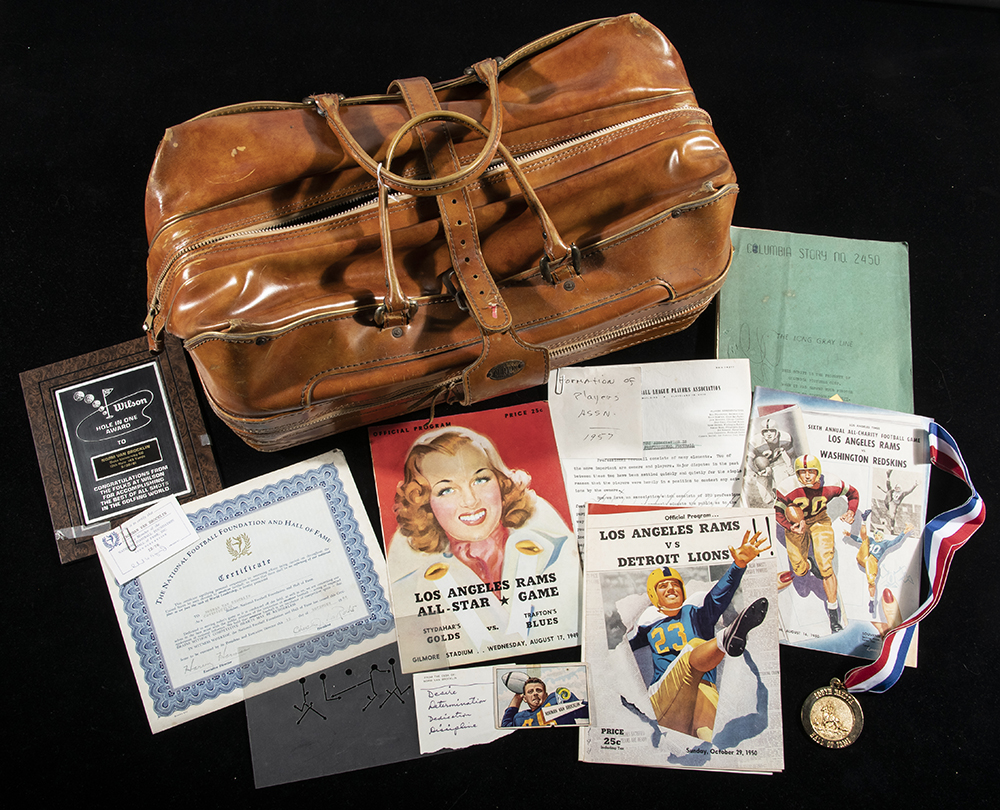 Description:Balance of the Norm Van Brocklin Collection. Extensive selection of vintage materials from the Van Brocklin collection to include as follows: Approx. (30) vintage football related publications c.1940-80s incl. several with NVB covers: (6) Los Angeles Rams programs c.1940-50s; 1991 South Dakota Hall of Fame presentation plaque and medal; 1981 Wilson Hole in One presentational plaque; Several typewritten documents (some with handwritten notations) relating to the formation of the NFL Player's Association in 1957; 1953 final draft copy of "The Long Grey Line" motion picture script Draft copy of the "Punt, Pass, and Kick" book by Norm Van Brocklin including numerous handwritten pages some of which feature hand drawn football plays; 1952 Bowman Van Brocklin card (PR); Vintage NFL documents and publications; small hand written desk not by NVB "Desire Determination Dedication Discipline"; Telegrams to NVB; Several handwritten letters on NFL team stationery to NVB; Several sports award banquet programs c.1960-70s; (2) celluloid play diagram templates; Hard bound 1962 Saturday Evening Post with NVB monogram; and Van Brocklin's personal vintage leather travel case c.1960-70s. Varied grouping with nice breakdown value. Includes letter of provenance from the Van Brocklin family: Range GD-NM
