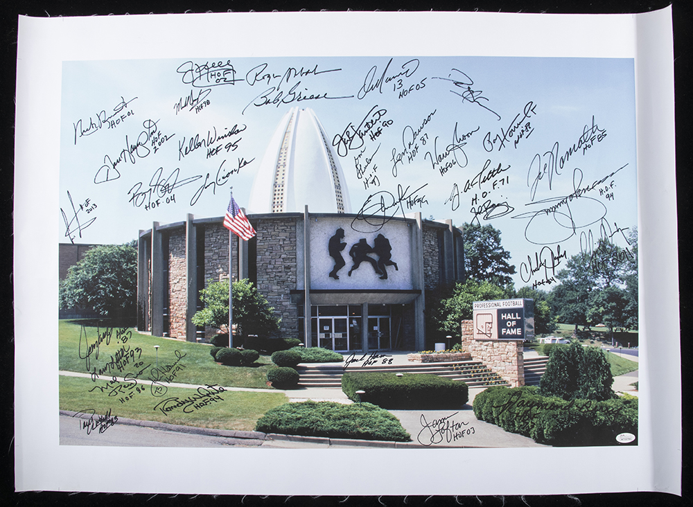 Description:Football Hall of Famers autographed large format print. Oversized image on cloth/canvas (35"x34.5") has been signed by (33) incl. Joe Namath, Barry Sanders, Randy White, John Hannah, Jim Kelly, Roger Staubach, Dan Marino, Jack Lambert, Len Dawson, Don Shula, Deion Sanders, John Riggins, Warren Moon, Y.A. Tittle, and others. Many have added an "HOF" inscription. All are done in marker rating 7/8 to 9/10 out of 10. JSA Authentication sticker affixed (LOA is not included): NM