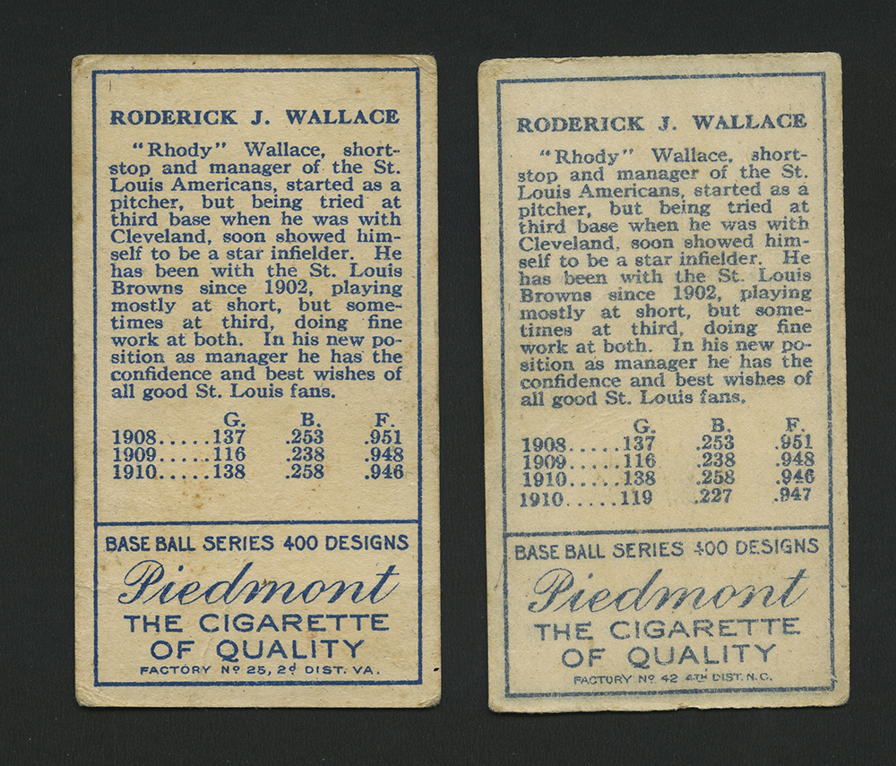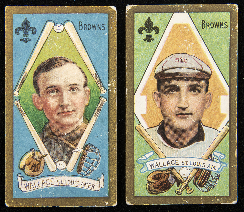 1911 T205 Gold Borders Bobby Wallace (2 variations). Includes Wallace with cap (GD) Wallace no cap and two lines stats (VG): GD and VG