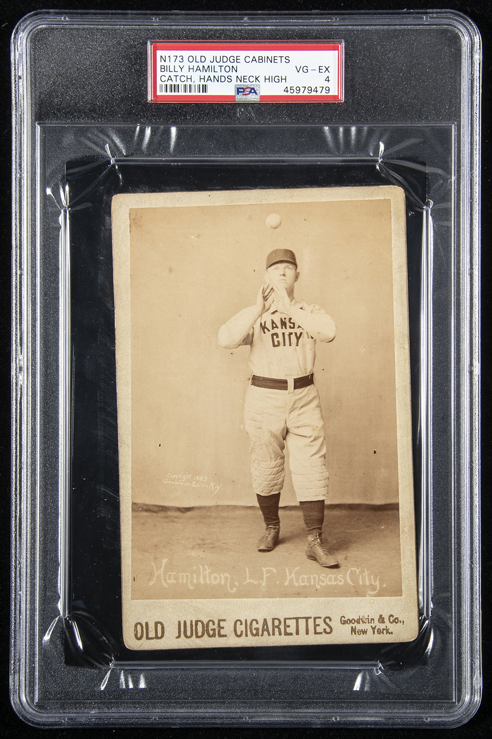 Description:Rare 1889 N173 Old Judge Cabinet Billy Hamilton. Exceedingly rare oversized issue showing the Hall of Famer in Kansas City Cowboys uniform is captioned within bearing an "1889" copyright date. In very strong overall condition with a touch of light toning/discoloration and hint of wear (most notable is a vertical scratch which runs down the back). Image is crisp and offers choice registration. The only example which has been graded by PSA and one of just (61) total cabinets from this issue on their population report: PSA VG-EX 4