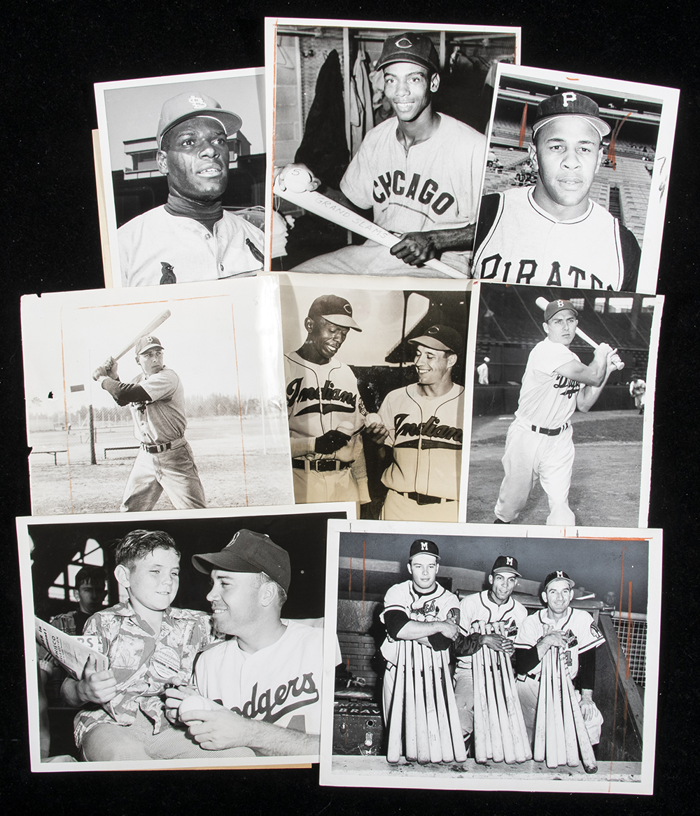 Description:Collection of (37) vintage baseball photographs c.1940-60s. Fine grouping comprised of Hall of Fame players images. Subjects include (3) Ernie Banks, Feller/Paige, (4) Al Kaline, (3) Eddie Mathews, Joe DiMaggio, (3) Duke Snider, Maris HR photo, (3) Hank Aaron, Roy Campanella, and (3) Gil Hodges. Various news service stampings on the back with varying degrees of light to moderate surface wear on front. Sizes range from 4"x6" to 8"x10" with some portion having period photo masking ink on front which is likely removable if so desired. Excellent breakdown value: Range GD/VG-NM