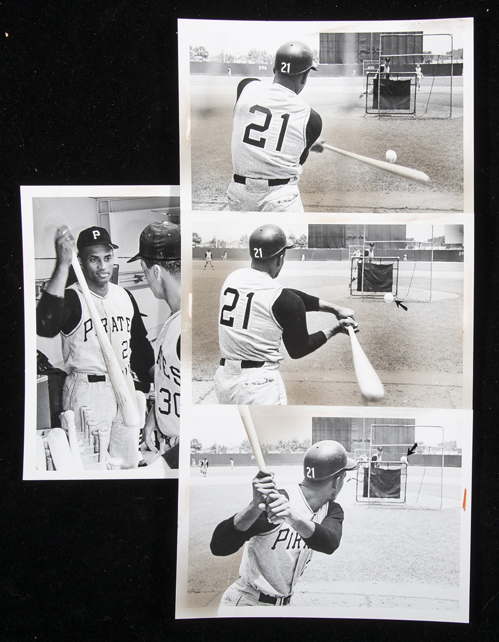 Lot of (4) 1967 Roberto Clemente photographs. Each black and white photograph measures 5"x7" showing Clemente in batting poses and a locker room image with Maury Wills. Stamped and dated 1967 on the reverse: Range VG-EX