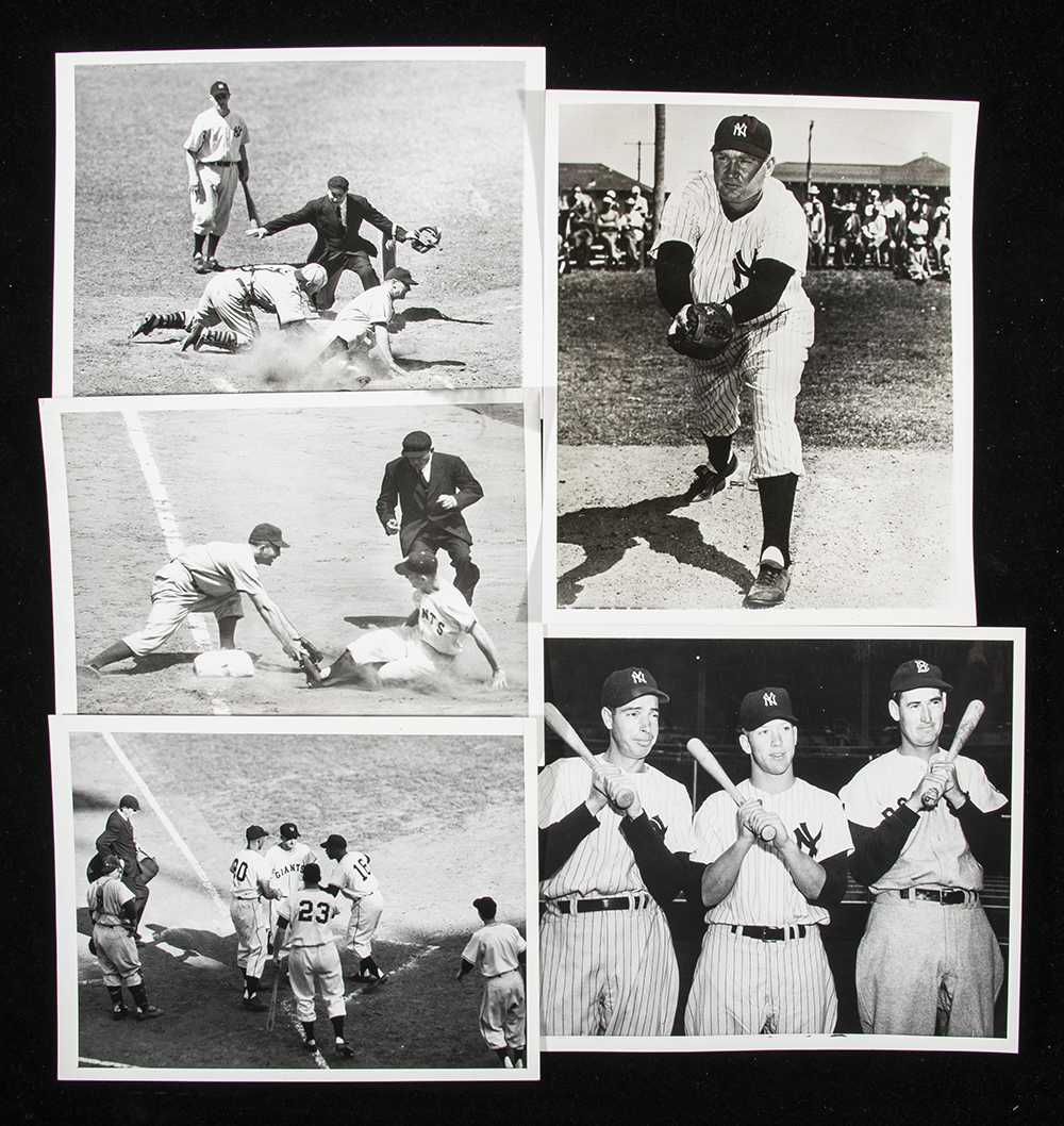 Description:Lot of (10) vintage baseball photographs c.1940-60s. Sizes range from 7"x9" to 8"x10" with subjects to include Joe DiMaggio, Johnny Mize, Mickey Mantle, and Tommy Henrich. Stamped on the reverse by various news service agencies: Range VG-NM