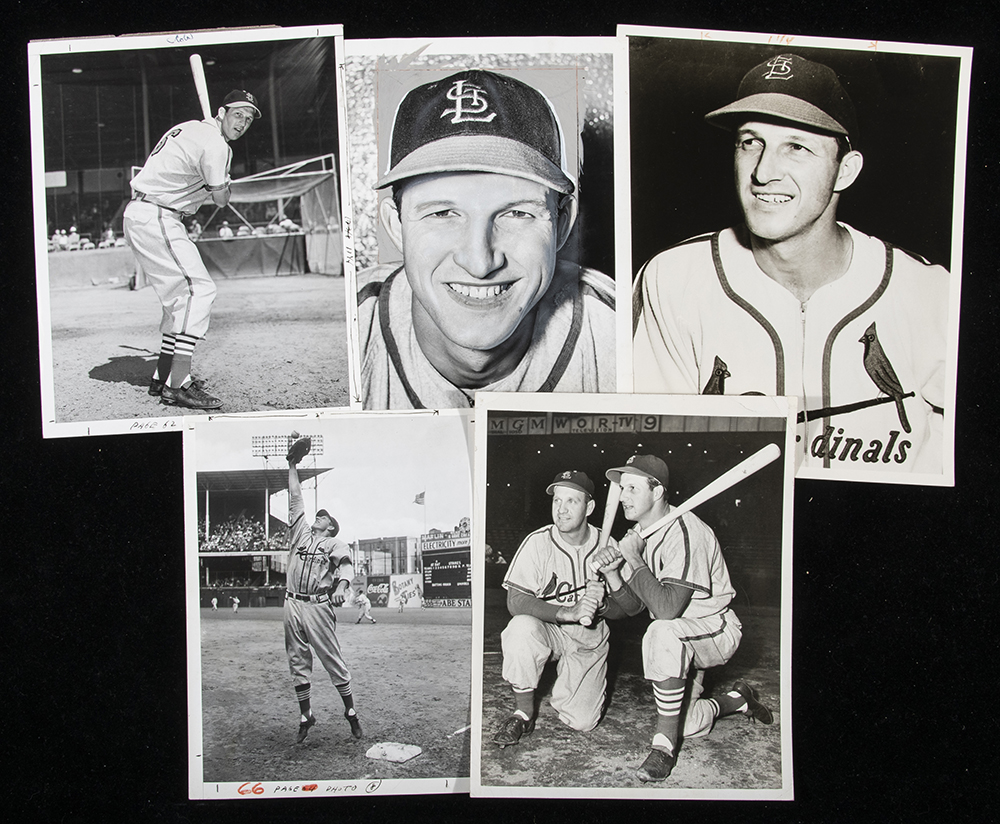 Lot of (5) Stan Musial photographs c.1940-50s. Sizes range from 6"x8" to 8"x10" including portrait and action views. Varied back stampings including Acme Newspictures and International News Service: Range VG-NM