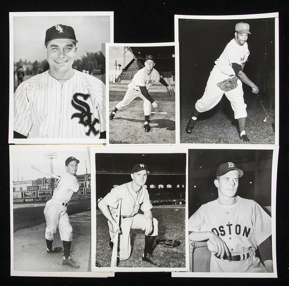 Description:Lot of (10) vintage baseball photographs c.1950-60s. Sizes range from 4"x6" to 8"x10" with subjects to include Johnny Mize, Gil Hodges, Davey Williams, and Rogers Hornsby. Stamped on the reverse by various news service agencies: Range VG-NM