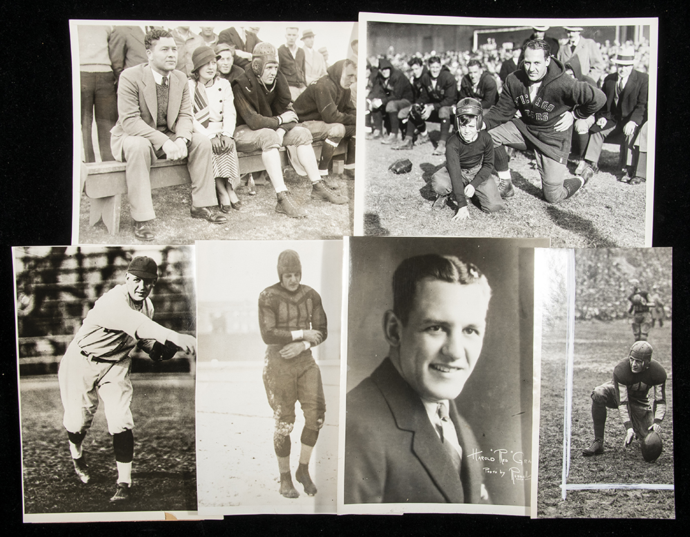 Description:Lot of (6) vintage Harold "Red" Grange related photographs c.1920-30s. Sizes range from 4"x8" to 7"x9" with Grange pictured in various action and candid poses. Subjects include 1925 Grange holding ball, 1925 Grange in baseball uniform, 1925 portrait, and 1933 with Chicago Bears. Various news service stampings on the back with varying degrees of light to moderate surface wear on front. Very fine lot with strong breakdown value: Range GD-VG/EX