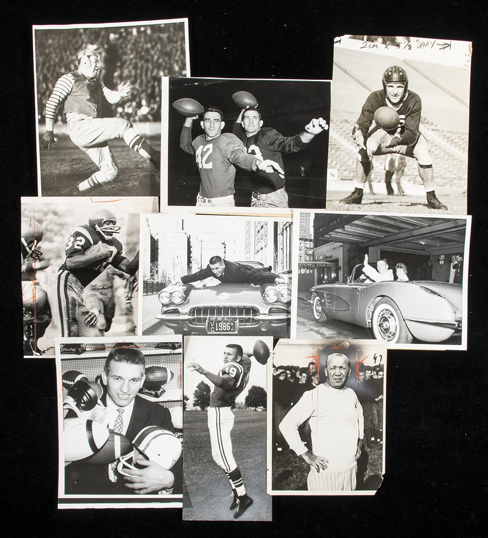 Description: Lot of (12) vintage football related photographs c.1930-70s. Sizes range from 6"x8" to 8"x10". Subjects include Lombardi, several J. Unitas, Jim Brown, O.J. Simpson, and Knute Rockne. Various news service stampings on the back with varying degrees of light to moderate surface wear on front: Range GD-VG/EX