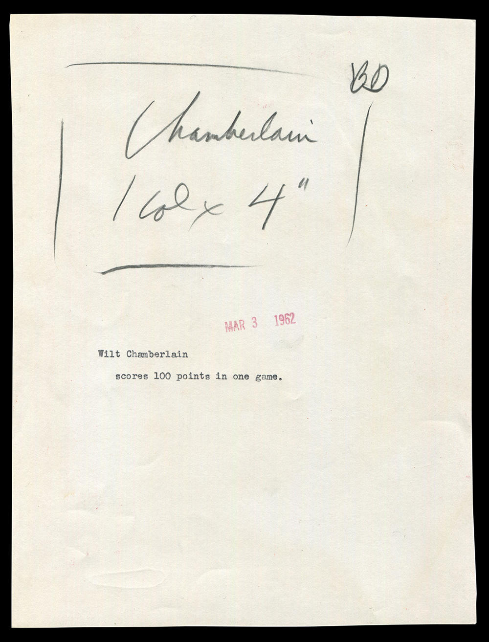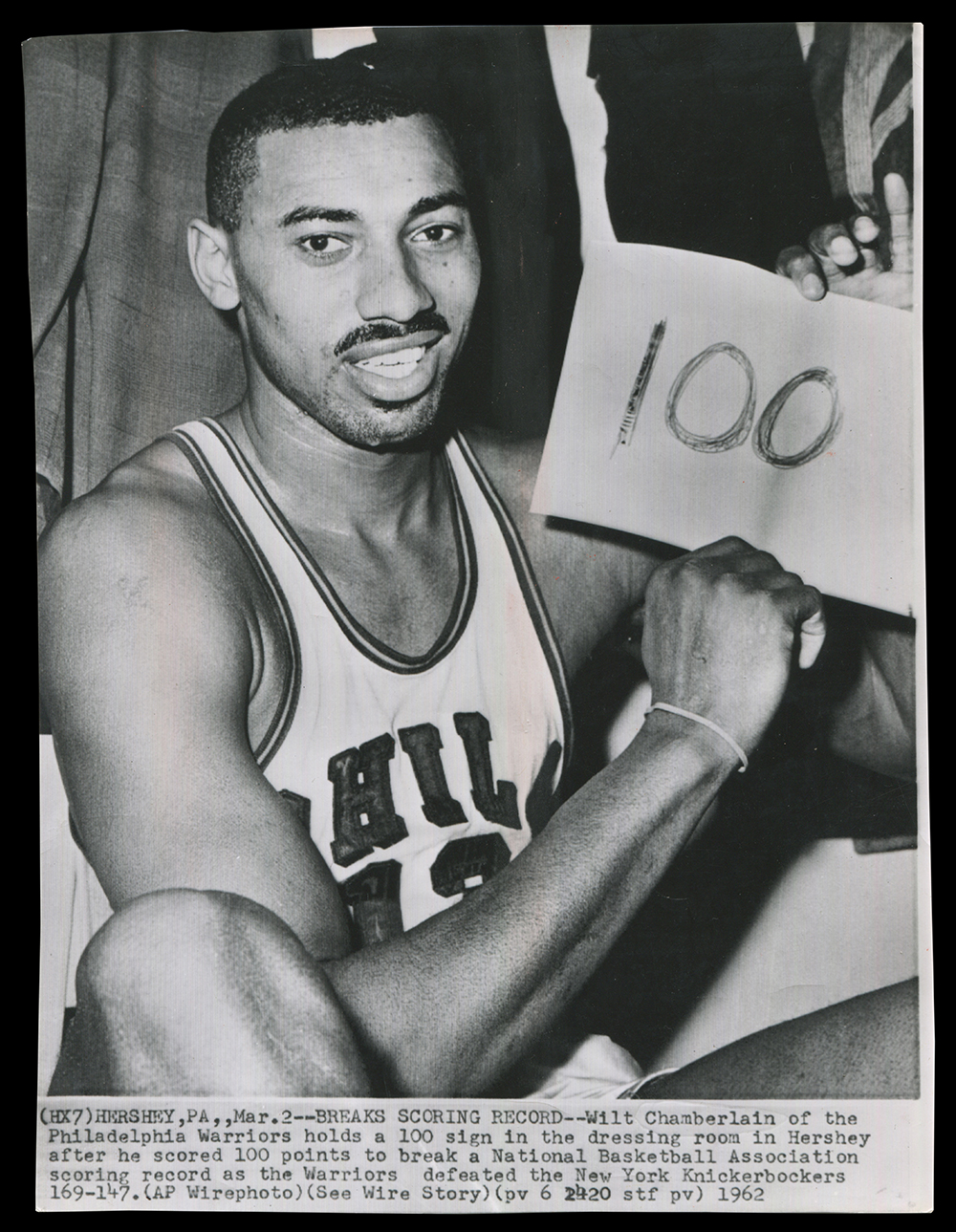 Description:March 2, 1962 Wilt Chamberlain 100 Point Game photograph (PSA/DNA Type III). Vintage black and white 7"x9" wire service image picturing Wilt Chamberlain after his historic 100 point game as played in Hershey, PA. Photo has embedded by line at bottom margin with dating and identification information. Period pencil notations in back with stamped date of Mar 3 1962 and typewritten identification. Includes LOA from PSA/DNA (Type III): EX-EX/MT