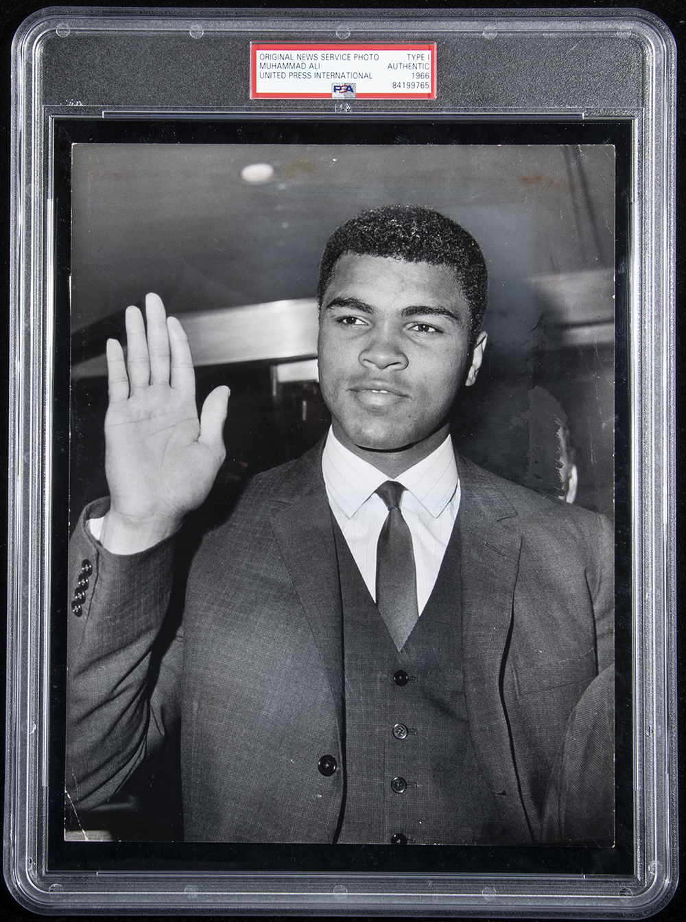 Description:Cassius Clay photograph c.1966 (PSA/DNA Type I). Black and white 8"x10" image showing Clay leaving England after defeating Brian London to defend his title. Few areas of photo masking ink on the front with United Press International stamping on back. Encapsulated by PSA/DNA (Type I): VG-EX
