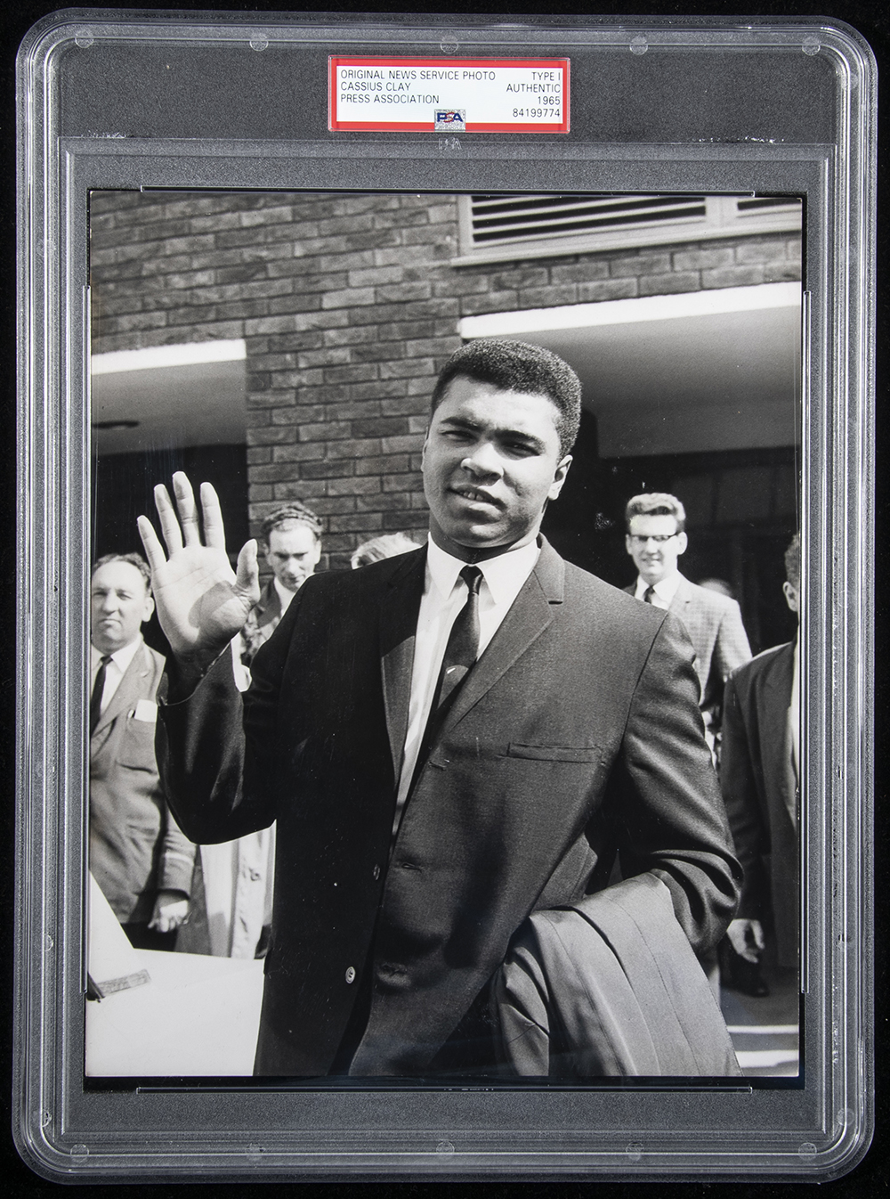 Description:Cassius Clay photograph c.1965 (PSA/DNA Type I). Black and white 8"x10" image showing Clay arriving in London to train for an exhibition fight. Stamped by Associated Press on the reverse retaining its original paper i.d. labeling. Encapsulated by PSA/DNA (Type I): EX