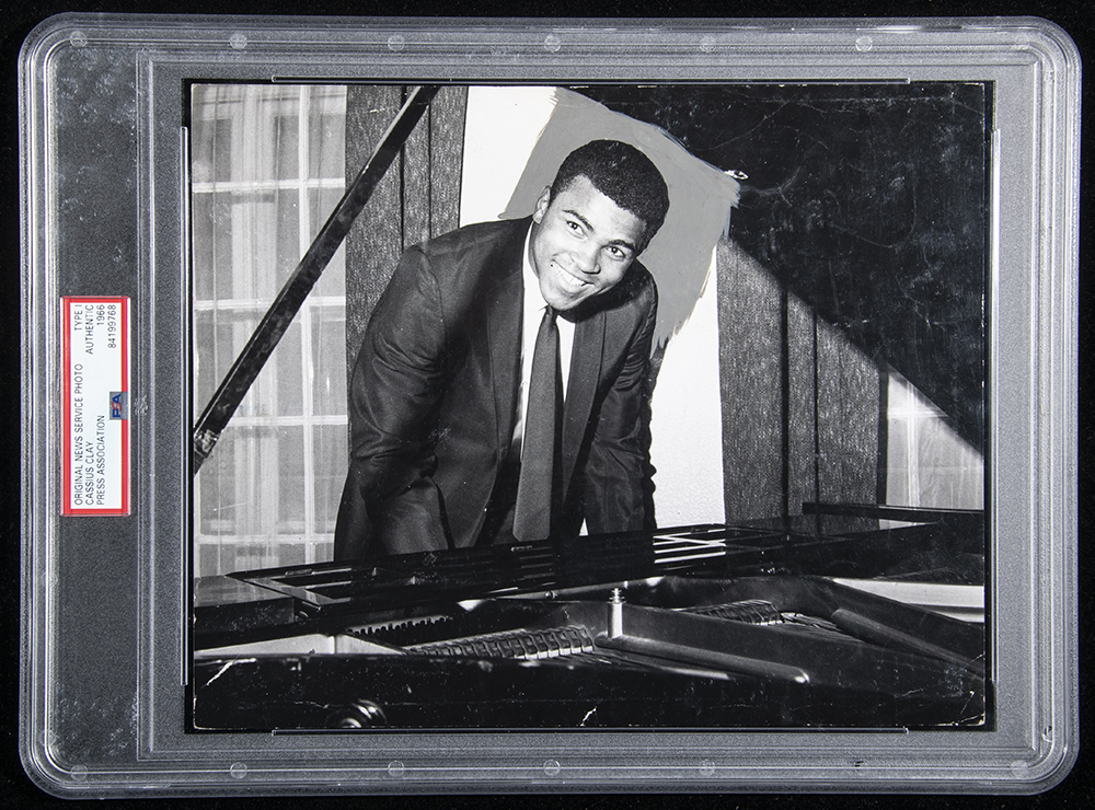 Description:Cassius Clay photograph c.1966 (PSA/DNA Type I). Original 8"x10" black and white image picturing Cassius Clay posed at a piano in street clothes. Photo masking ink around head area of Clay with Associated Press stamping on back retaining its original paper i.d. labeling. Encapsulated by PSA/DNA (Type I): VG-EX