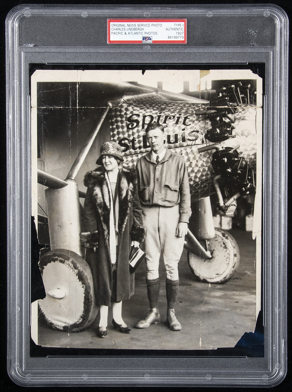 Description:Charles Lindbergh "Spirit of St. Louis" photograph c.1927 (PSA/DNA Type I). Sepia tone 8"x10" image picturing Capt. Lindbergh and his mother posed in front of the iconic Spirit of St. Louis airplane. Creasing throughout with some corner chipping and area of taped reinforcement to the back. Stamped by Daily Mirror on the back with original paper i.d. labeling affixed. Encapsulated by PSA/DNA (Type I): GD-VG