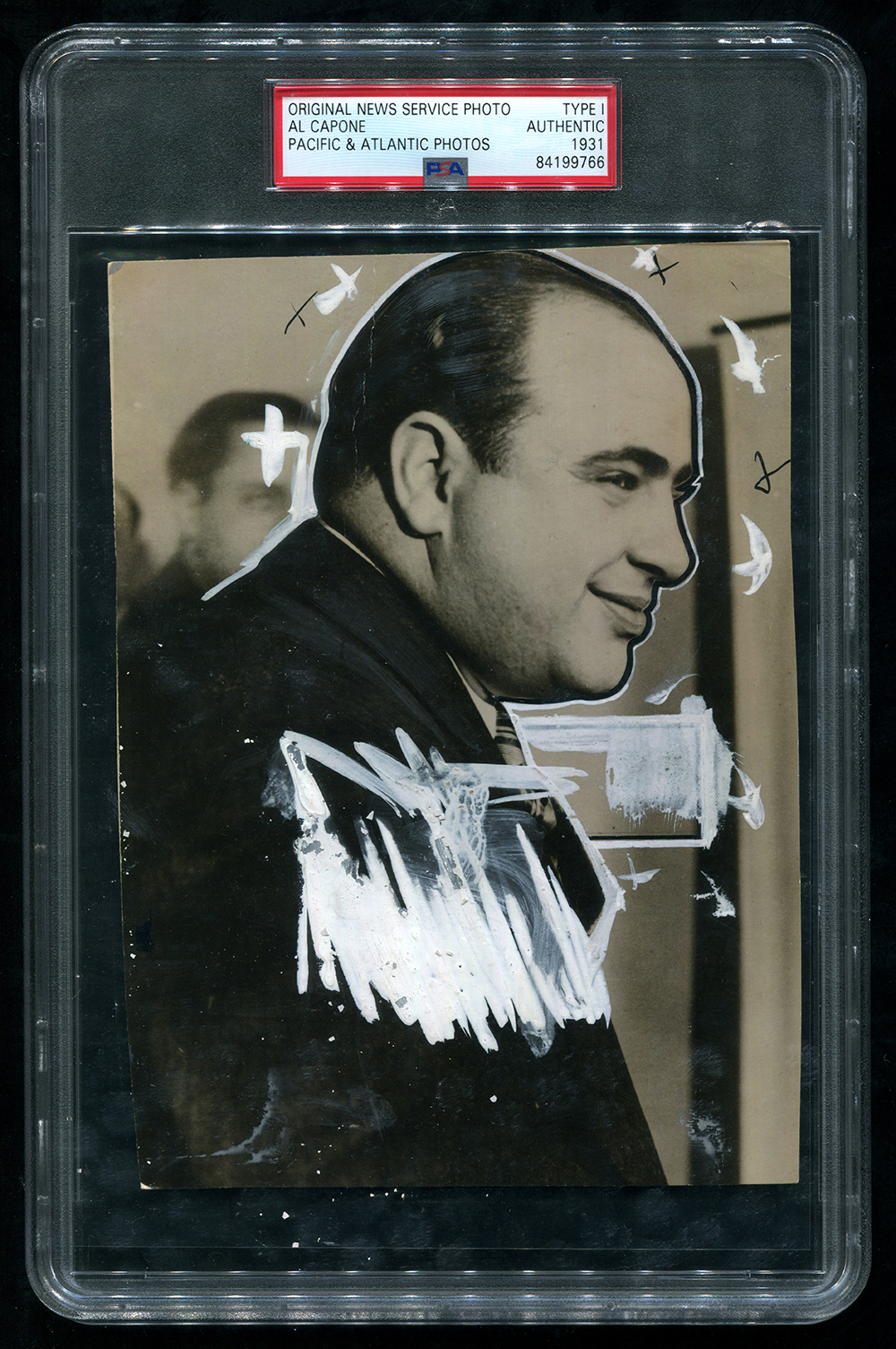 Description:Al Capone photograph c.1931. Sepia tone 5 1/2"x7 1/2" image of the notorious Chicago mob leader standing in suit. Several areas of period photo masking ink found on the front which are likely removable if so desired. Stamped by Pacific & Atlantic photo on the back having with original paper i.d. labeling affixed. Encapsulated by PSA/DNA (Type I): VG