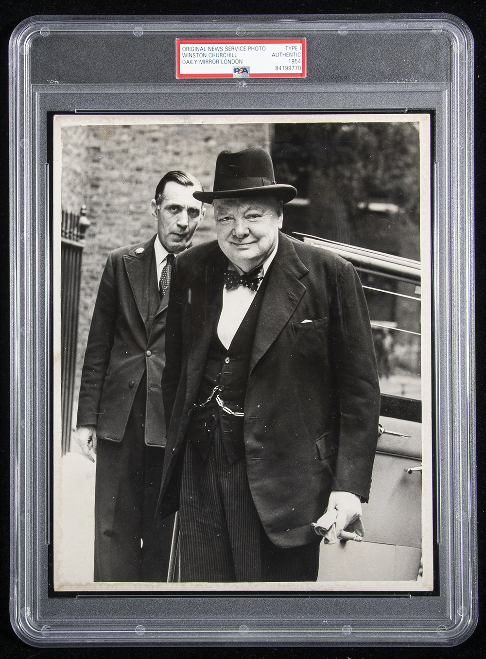 Description:Winston Churchill photograph c.1954 (PSA/DNA Type I). Original 8"x10" black and white image of the famed British statesman standing in classic suit attire. Stamped by the Daily Mirror on back with paper identification label affixed. Encapsulated by PSA/DNA (Type I): EX