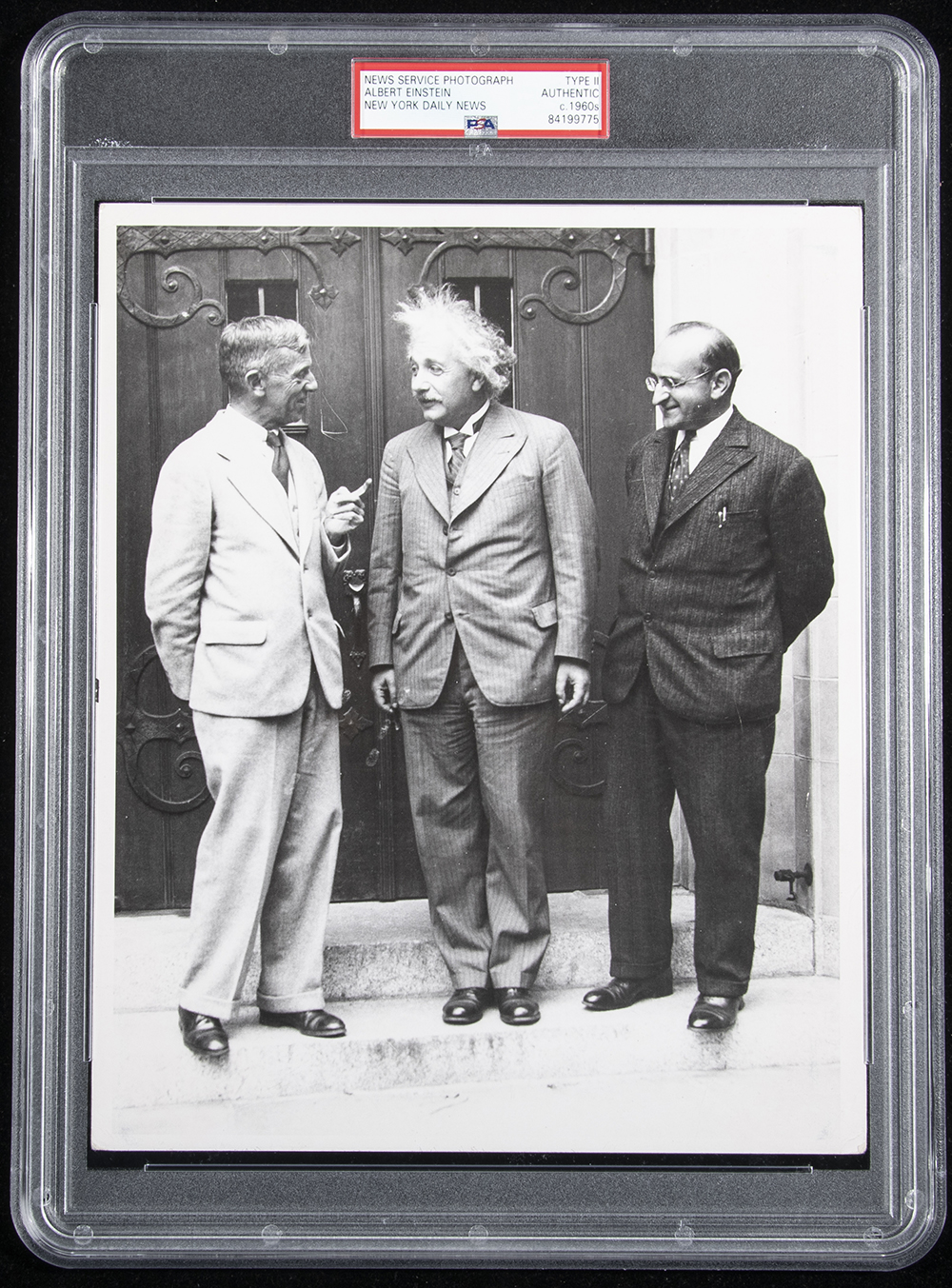 Albert Einstein photograph c.1960s (PSA/DNA Type II). Black and white 8"x10" image showing Einstein standing with two other gentleman. Stamped by NY News on the reverse. Encapsulated by PSA/DNA (Type II): EX-MT