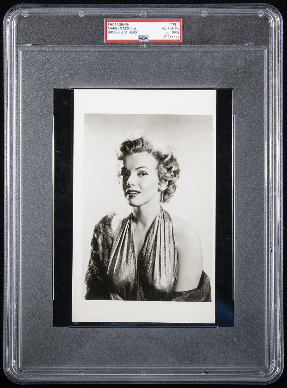 Marilyn Monroe photograph c.1960s (PSA/DNA Type I). Black and white 5"x8: studio portrait image of Monroe with beautifully composed execution and lighting. Stamped by Brown Brothers on the reverse. Encapsulated by PSA/DNA (Type I): EX-MT