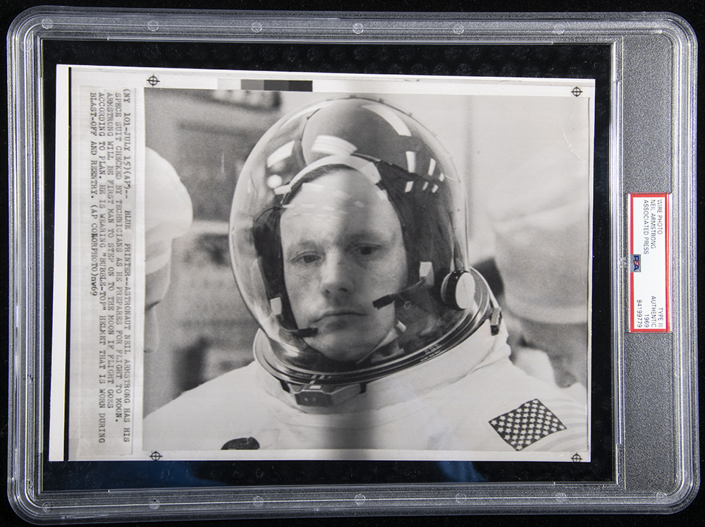 Description:Neil Armstrong photograph c.1969 (PSA/DNA Type III). Black and white 7 1/2"x10" image picturing Armstrong in full astronaut gear in preparation for his historic trip to the moon. Associated Press by line embedded within image at the bottom and stamped/dated on the reverse. Encapsulated by PSA/DNA (Type III): EX