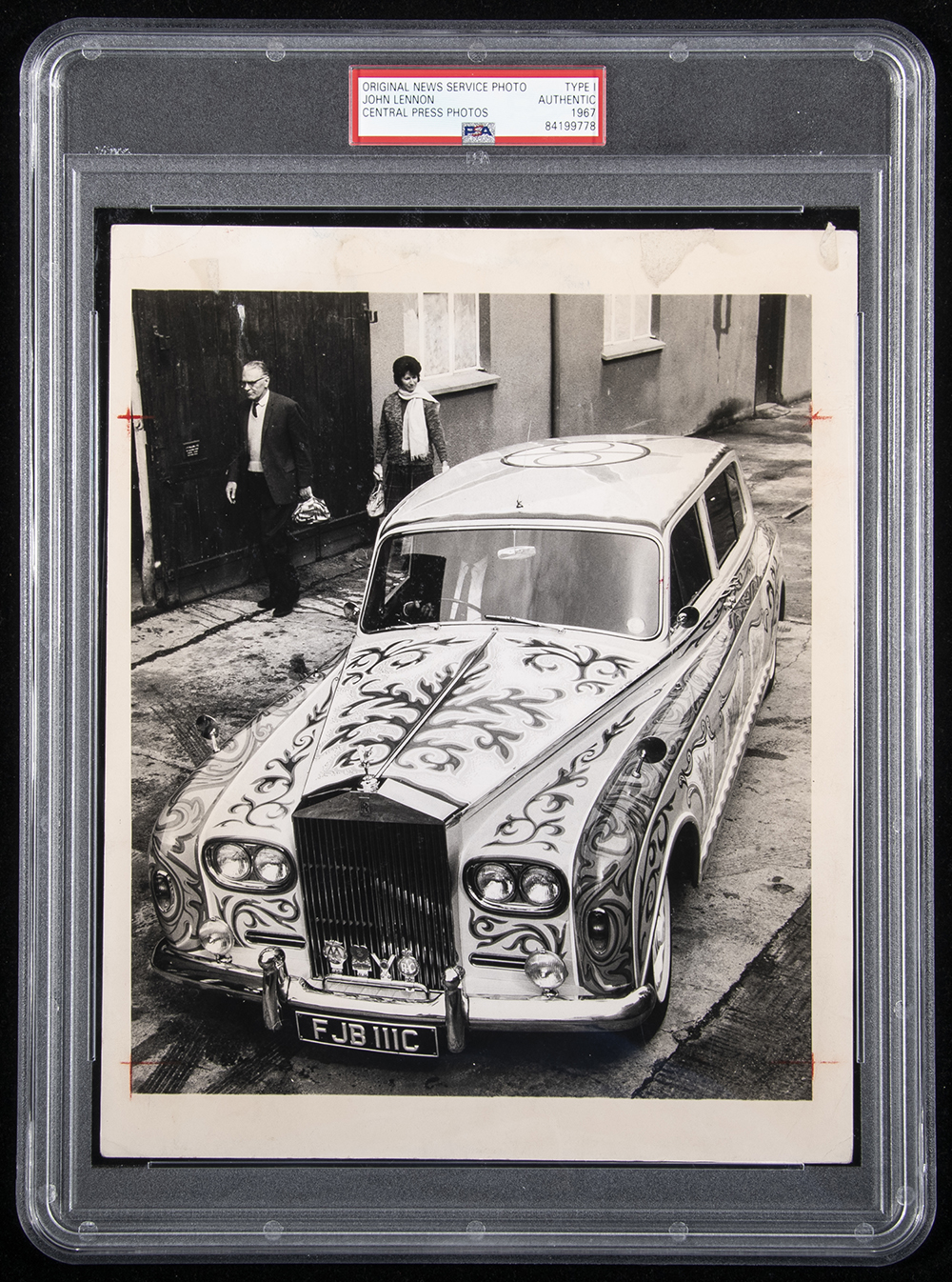 Description:John Lennon Rolls Royce photograph c.1967 (PSA/DNA Type I). Sepia tone 8"x10" image picturing John Lennon's custom painted Rolls Royce parked outside of his London garage. Stamped Central Press Photos on the back retaining its original paper i.d. labeling. Encapsulated by PSA/DNA (Type I): VG-EX