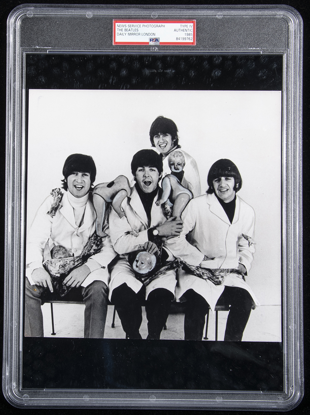 Description:Beatles photograph c.1985 (PSA/DNA Type IV). Black and white 8" square image of the famed "Butcher" album cover picturing the band members staged with various doll parts in butcher attire. Stamped by the Daily Mirror on the reverse with 1985 print date. Encapsulated by PSA/DNA (Type IV): EX