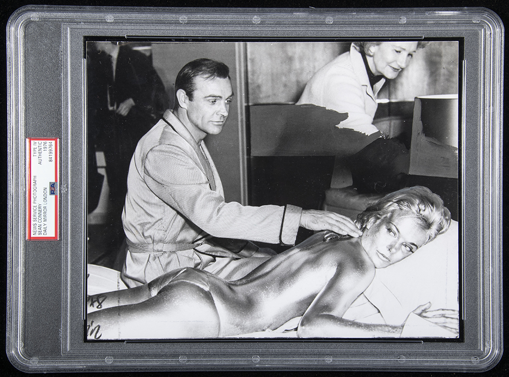 Description:James Bond "Goldfinger" photograph c.1976 (PSA/DNA Type I). Black and white 8"x10" image picturing Sean Connery and Shirley Eaton during a scene of "Goldfinger". Stamped by Golden Mirror on the back with several period notations. Encapsulated by PSA/DNA (Type IV): EX-MT